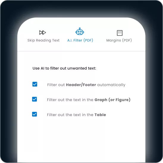 With AI Smart Filter you can choose to skip distracting text like headers, footers, and more for a more natural reading experience.